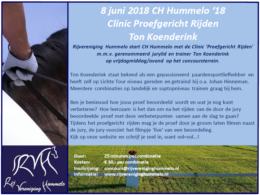 Paarden, pony’s en alle klasses zijn welkom, een startpas is niet nodig. Inschrijving is mogelijk door een e-mail o.v.v. Proefgericht Rijden te sturen naar concours@rijvereniginghummelo.nl en vermeld hierbij naam ruiter/amazone, naam paard/pony, klasse en welk proefnummer je wilt rijden. Schrijf je snel in…we hebben nog een paar extra plaatsen kunnen creëren aan het begin van de middag. Indien je wat minder flexibel bent, dan zetten we je op de wachtlijst. Wellicht valt er nog iets te schuiven op het moment dat de startlijst wordt gedeeld met de deelnemers.